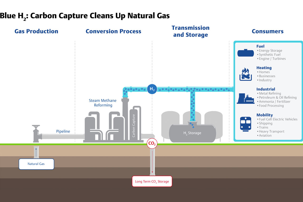 蒸汽甲烷重整过程分为三个阶段。 首先,天然气与蒸汽、压力和催化剂反应产生氢气、一氧化碳和少量二氧化碳。 在下一阶段,称为“水煤气变换反应”,蒸汽和一氧化碳与催化剂反应产生二氧化碳和更多的氢气。 在最后阶段,通过“变压吸附”产生纯氢气,其中二氧化碳和其他杂质被去除。 在传统的灰色氢气生产过程中,二氧化碳废气被释放到大气中。 相反,对于蓝色氢气,大部分二氧化碳分子被捕获并返回地下进行长期储存。