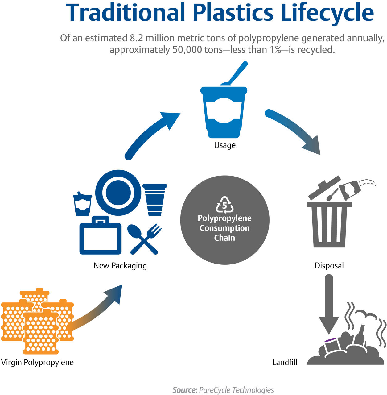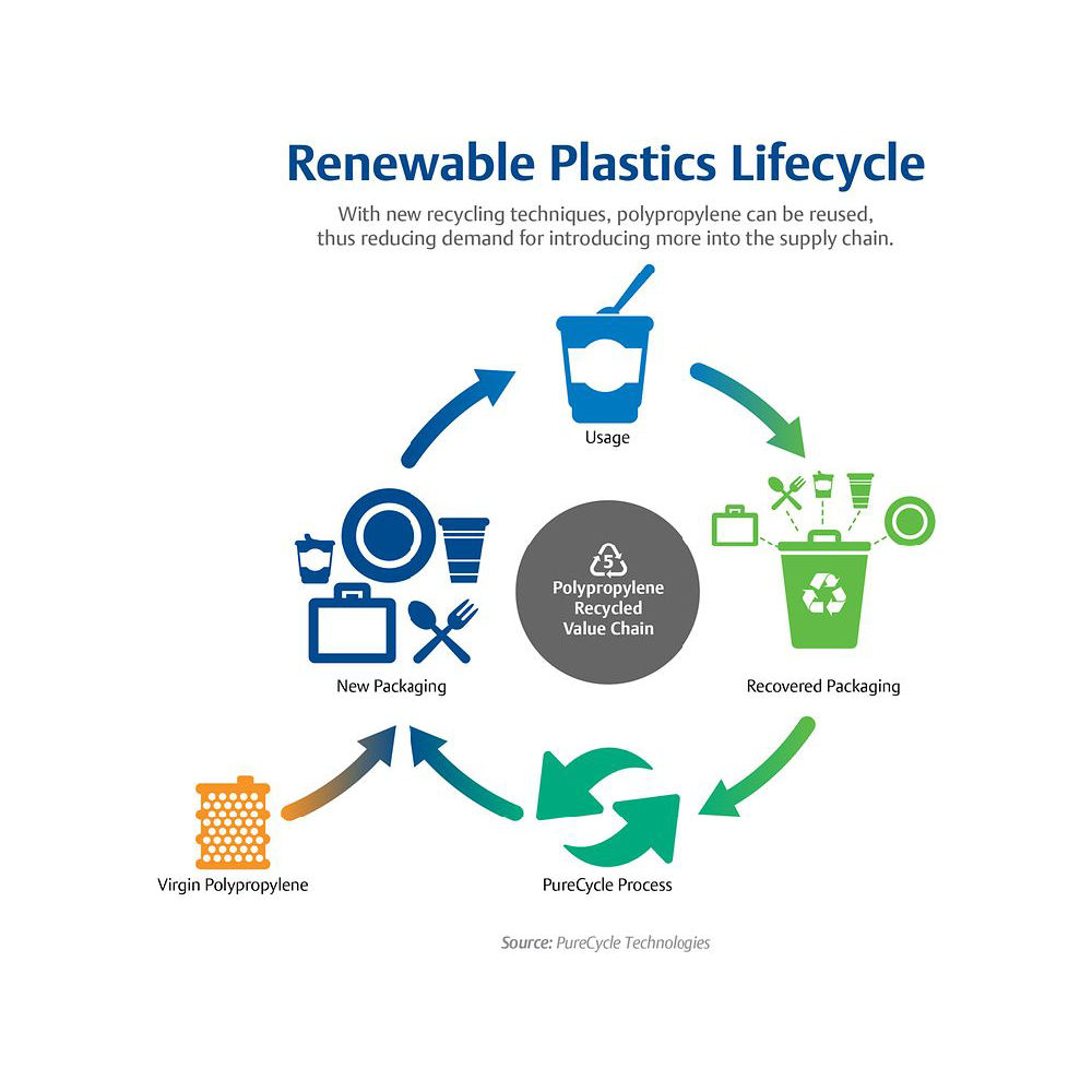 事实上,每年生产的 1700 亿磅的聚丙烯塑料中,只有不到 1% 被回收再利用。 这意味着巨大的市场潜力,即进一步回收利用帮助其融入循环经济。 通过在产品生命周期结束时回收资源并将其重新投入生产,循环经济将产品对环境的压力降至最低。 具体而言,在回收和再利用现有产品方面,主要目标也是减少环境中的碳含量。